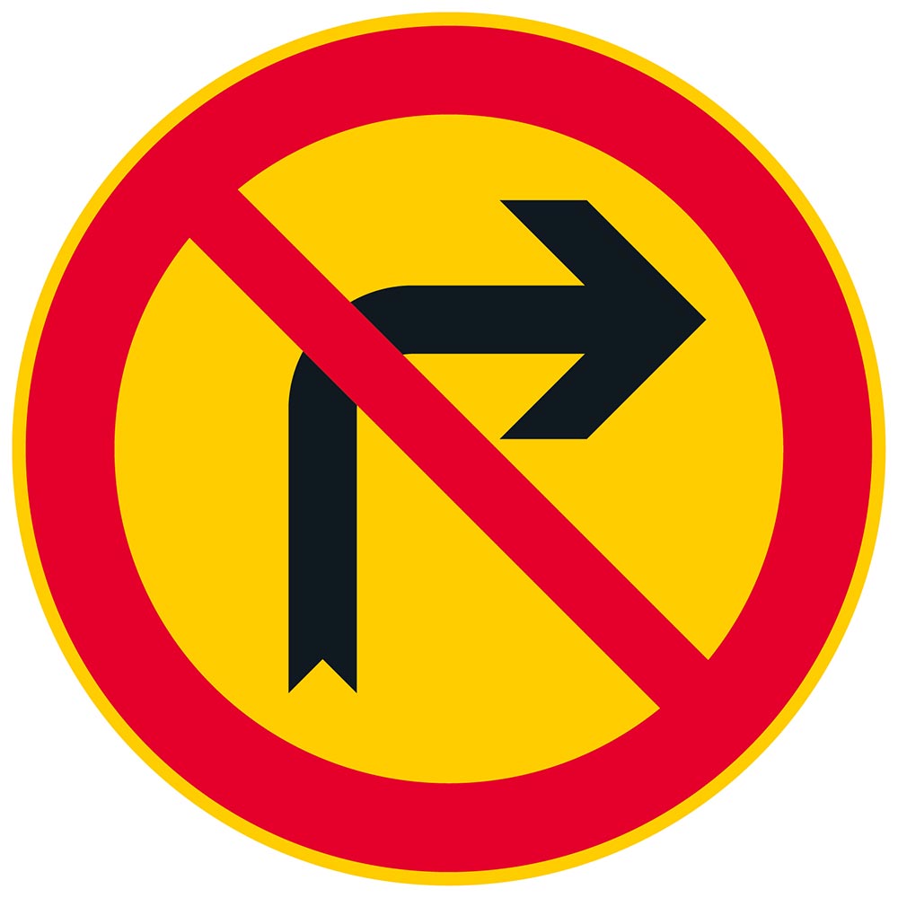 Märket anger att högersvängar med fordon är förbjudna i korsningen, om inte en tilläggsskylt anger något annat verkningsområde.