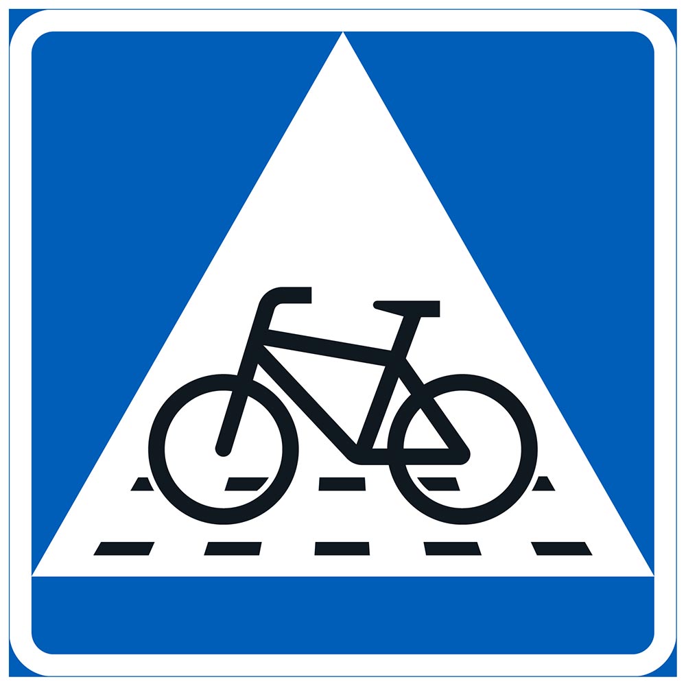 Med märket anges att fordon och spårvagnar ska väja för en cyklist som korsar körbanan på en fortsättning på en cykelbana. Med märket kan endast anges en i konstruktionshänseende upphöjd fortsättning på en cykelbana. Märket kan placeras på högra sidan av körbanan, ovanför körbanan, på en refug på körbanan eller på vänstra sidan av körbanan.